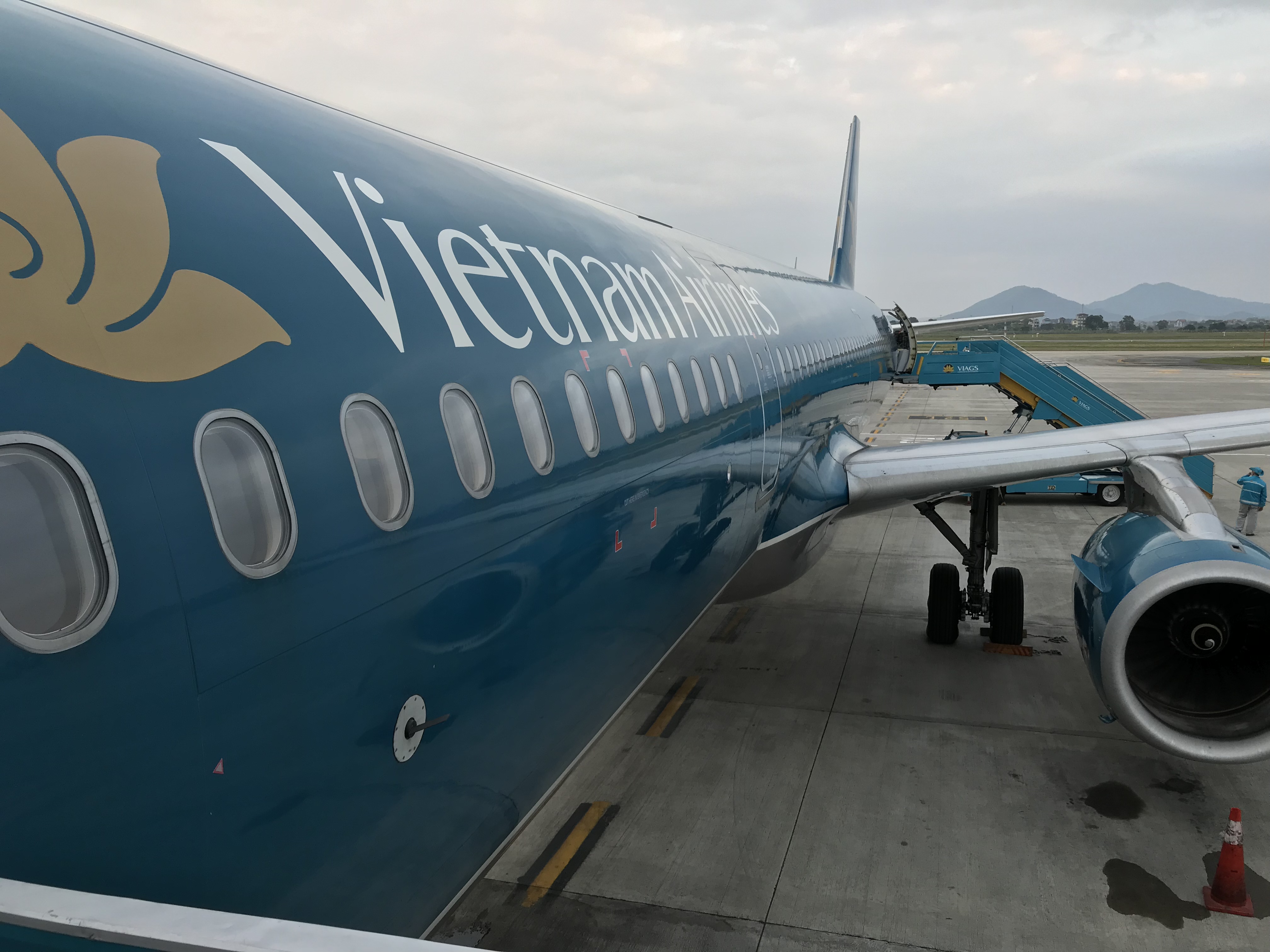 飛行機から、タラップで降りて、空港建物まで歩きます。