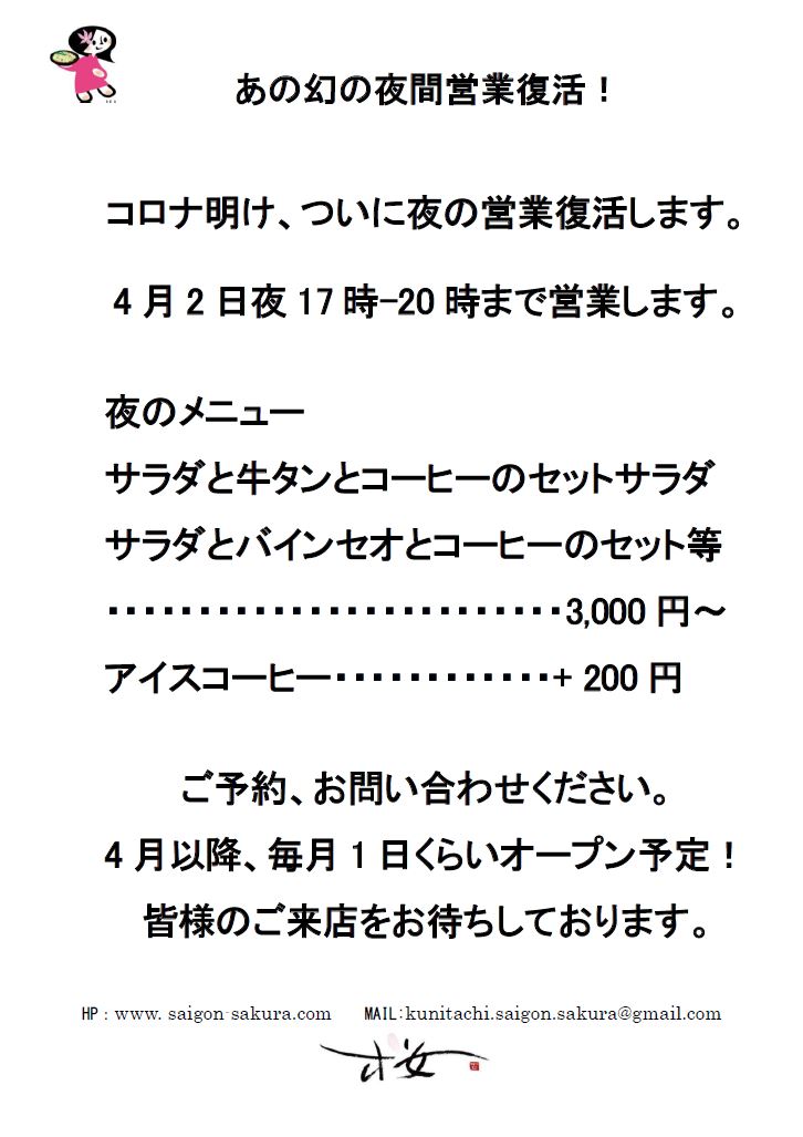 コロナ明け、ついに夜の営業復活します。