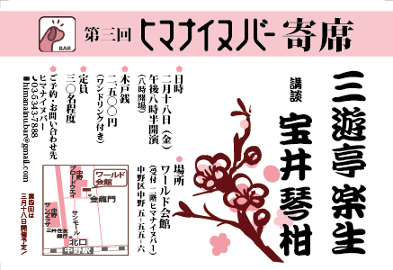 - 2月18日(金)第3回ヒマナイヌ バー寄席を行います。フライヤー