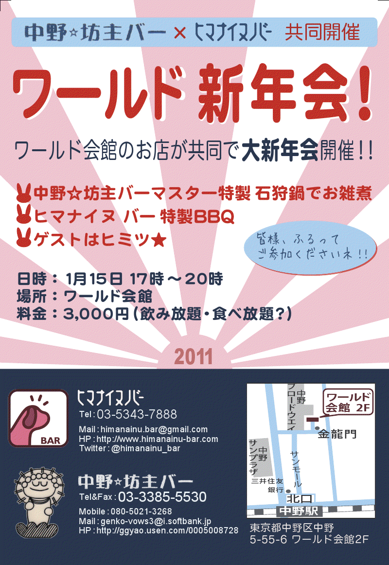 - 2011年1月15日(土) 17時~20時 中野☆坊主バー+ヒマナイヌ バー共同主催 ワールド新年会!を行います。フライヤー